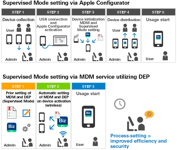 In cases of mass iOS device deployment, customers utilizing MDM services which emphasize security countermeasures were struggling with deployment costs resulting from the many necessary settings processes for each iOS device. But with Apple’s DEP, customers can automatically register their iOS device prior to joining an MDM service, without any direct device operation or preparation. In addition, the administrator’s pre-setting to skip some client’s operations will also make the entire setup and deployment process simpler and cheaper.
